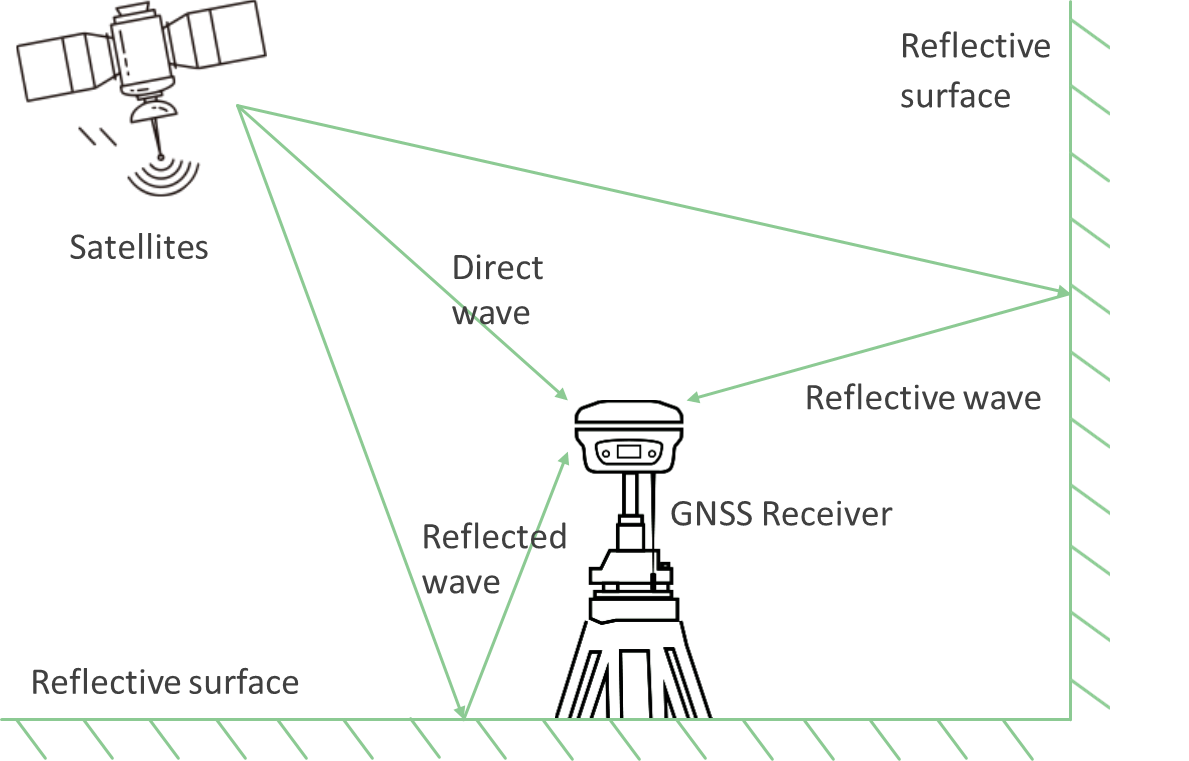 La interferencia por trayectos múltiples se produce cuando la señal del satélite se refleja en una superficie, como un edificio o un vehículo, y llega al receptor RTK en diferentes momentos, provocando errores en las mediciones GNSS.