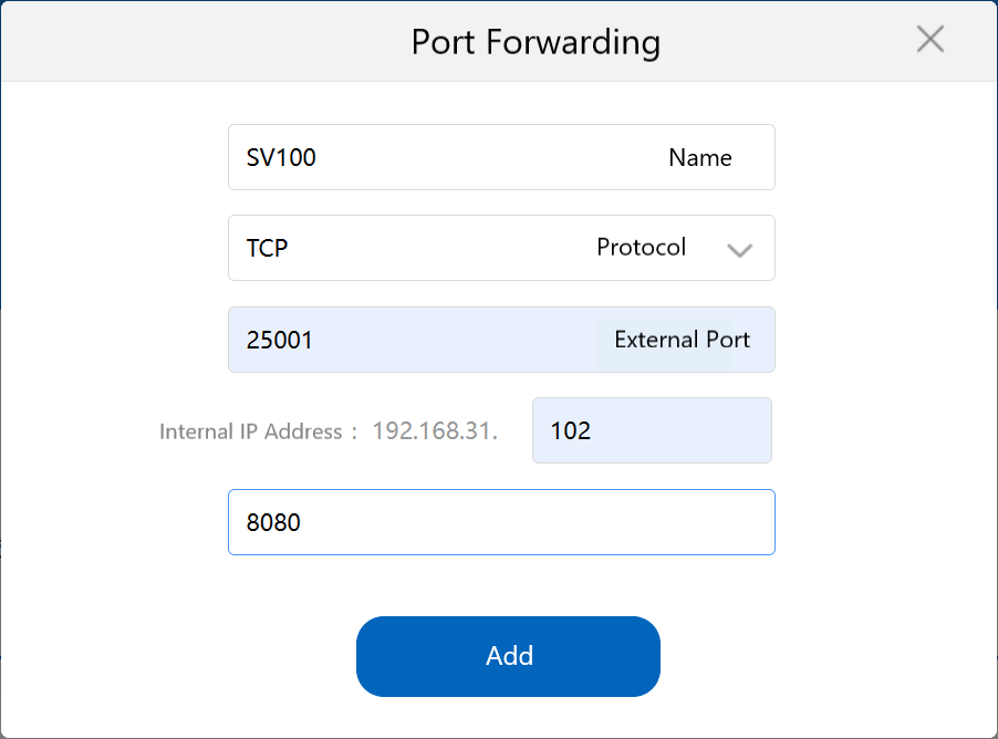 Luego ingrese a la web del enrutador, asignando el puerto interno del receptor al puerto externo del enrutador, como por ejemplo 25001.