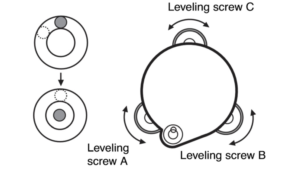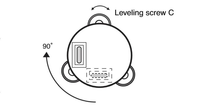 ② Ajuste los tornillos niveladores: Gire los tornillos niveladores A y B para mover la burbuja en el nivel circular. La burbuja ahora está ubicada en una línea perpendicular a una línea que pasa por los centros de los dos tornillos niveladores que se están ajustando. Luego gire el tornillo nivelador C para llevar la burbuja al centro del nivel circular.