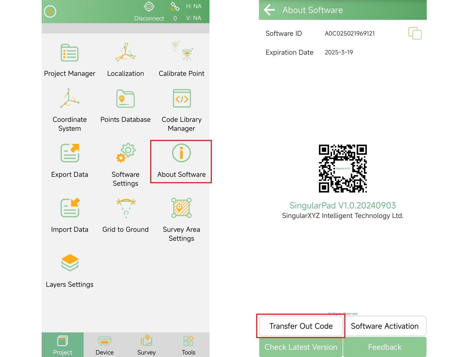 Abra SingularPad en el dispositivo anterior, navegue hasta Proyecto >> Acerca del software, haga clic en Transferir código de salida. Esto generará un código de licencia y un código QR para su licencia de software. Asegúrese de guardar este código de forma segura, ya que lo necesitará para activar el software en su nuevo dispositivo.