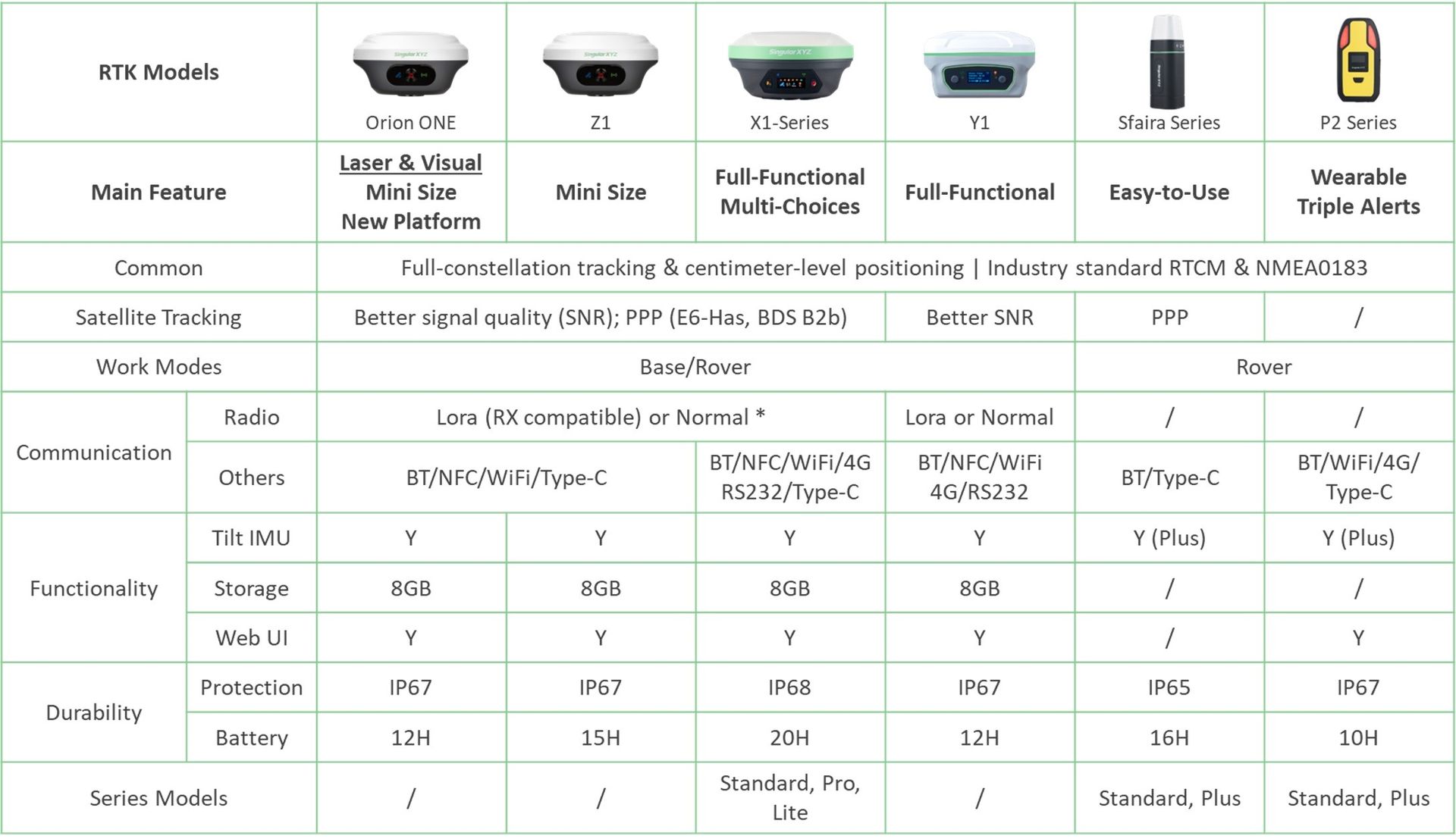 Al seleccionar el receptor RTK adecuado para sus necesidades específicas, es esencial considerar parámetros como la precisión, la funcionalidad de inclinación, la duración de la batería y la compatibilidad de comunicación. A continuación, comparamos las características clave y las especificaciones de rendimiento de la línea de receptores GNSS SingularXYZ.