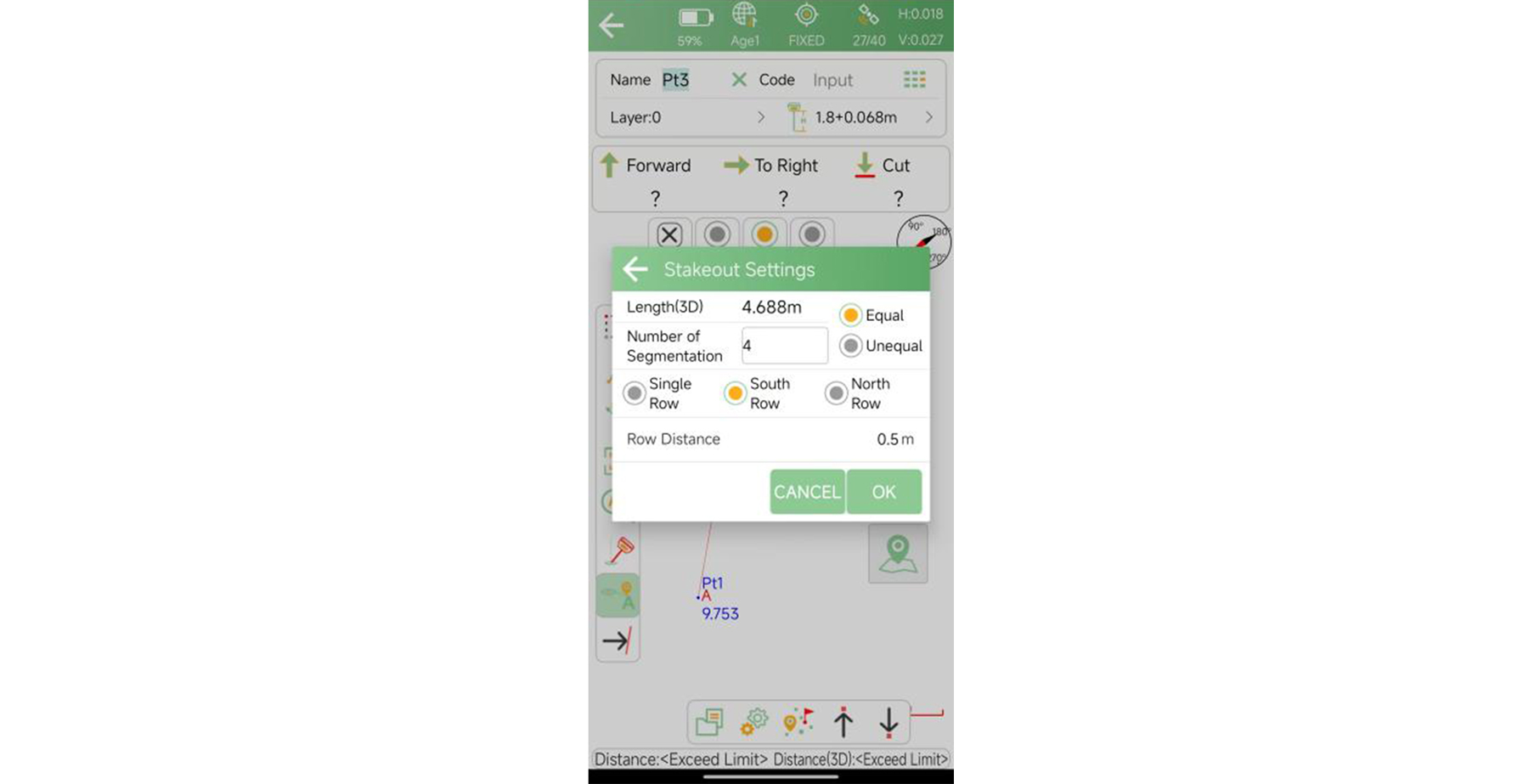 Fila sur/fila norte: organiza los puntos de replanteo según la distancia de fila especificada.