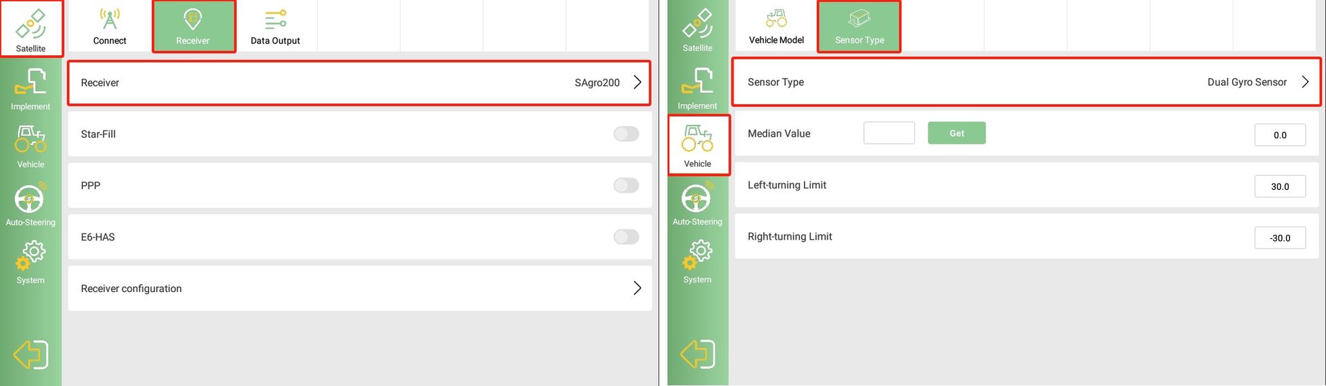Para el SAgro200, seleccione "SAgro200" en la opción de receptor y "Dual Gyro Sensor" en el tipo de sensor.