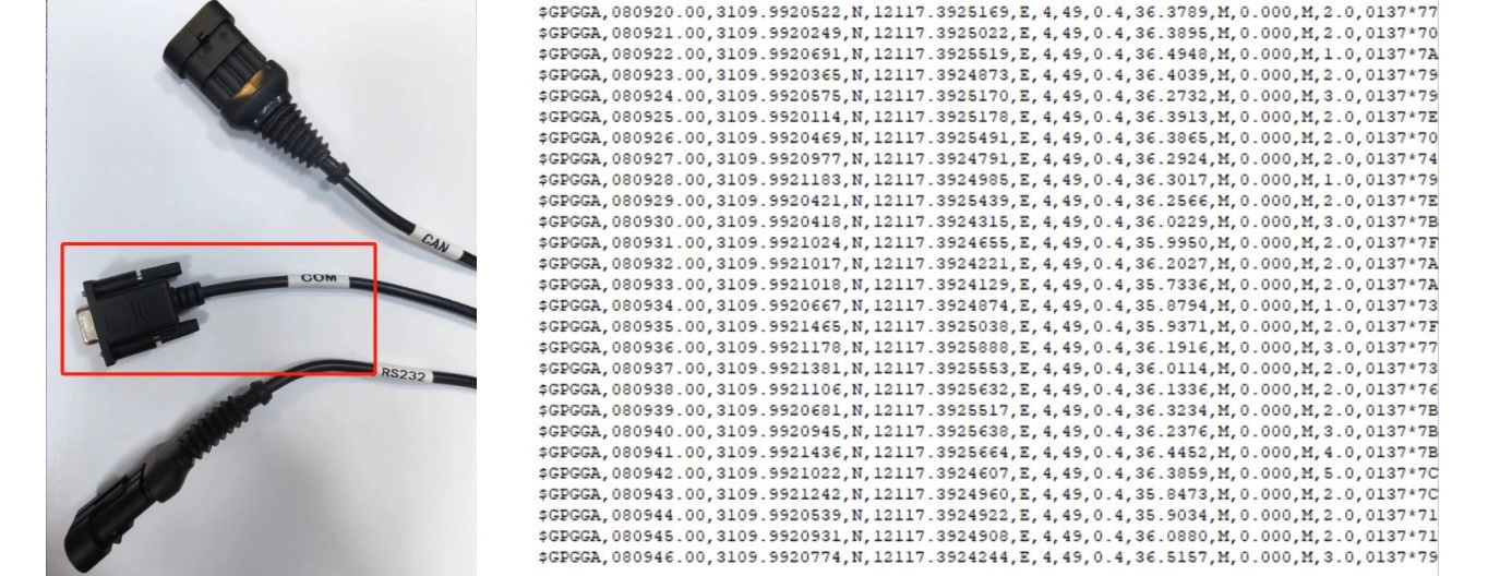 Para el SAgro200, estos mensajes NMEA se enviarán a través del puerto COM del cable del receptor. Como se muestra en la imagen siguiente, puede utilizar un convertidor de RS232 a USB para recopilar los mensajes de salida en su computadora portátil.