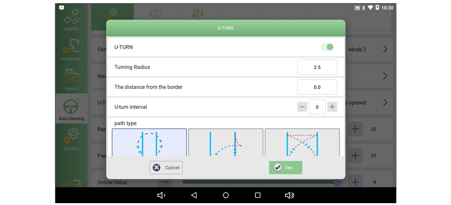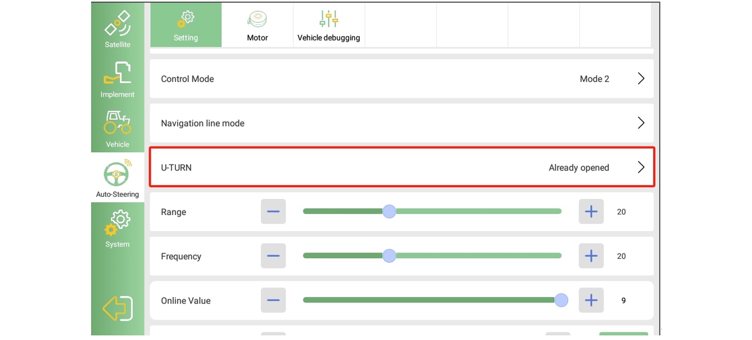 Abra el software PrecisionAg en la tableta de la consola SAgro-Series, navegue hasta la configuración del sistema >> Dirección automática >> Configuración, asegúrese de que el estado de la función U-TURN ya esté abierto de la siguiente manera.