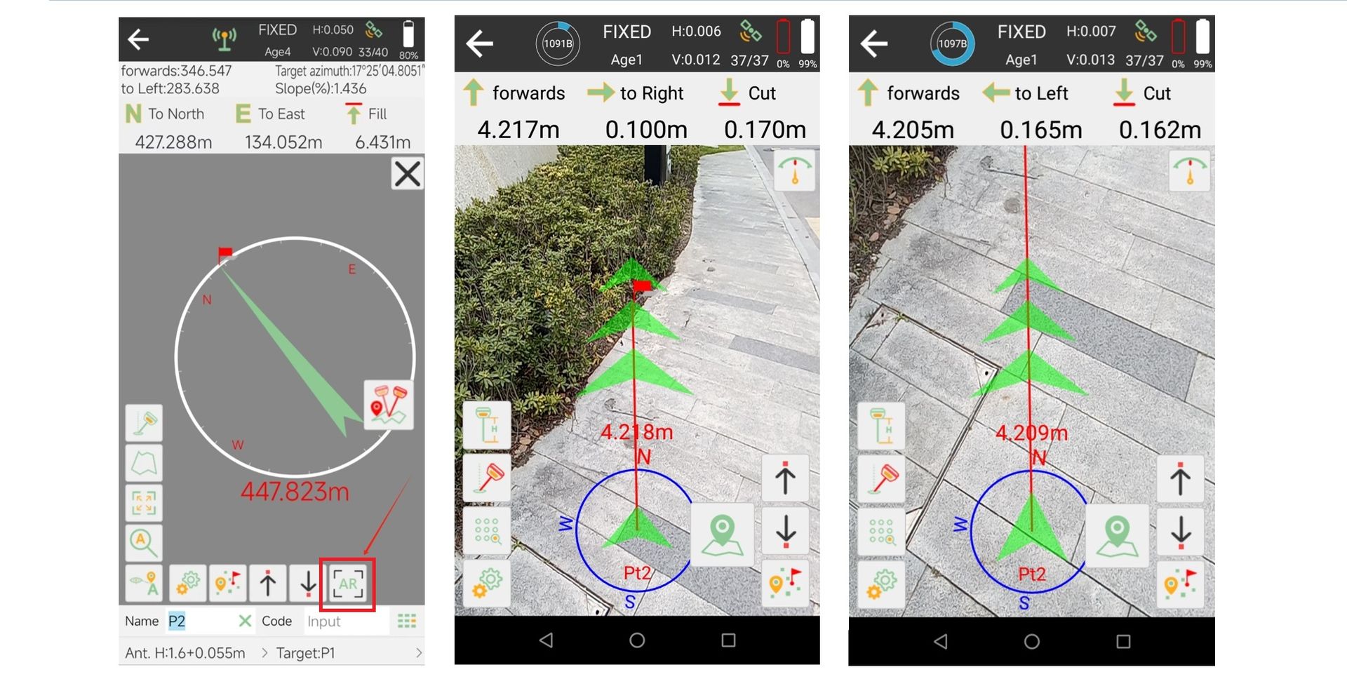 En esta interfaz, además de conservar las indicaciones de replanteo para el frente, atrás, izquierda, derecha, este, oeste y sur, la imagen de la cámara trasera también se muestra como fondo y la posición virtual del punto de replanteo se muestra en la imagen. Puede seguir las instrucciones de posición virtual. Ven a buscar el punto de replanteo.