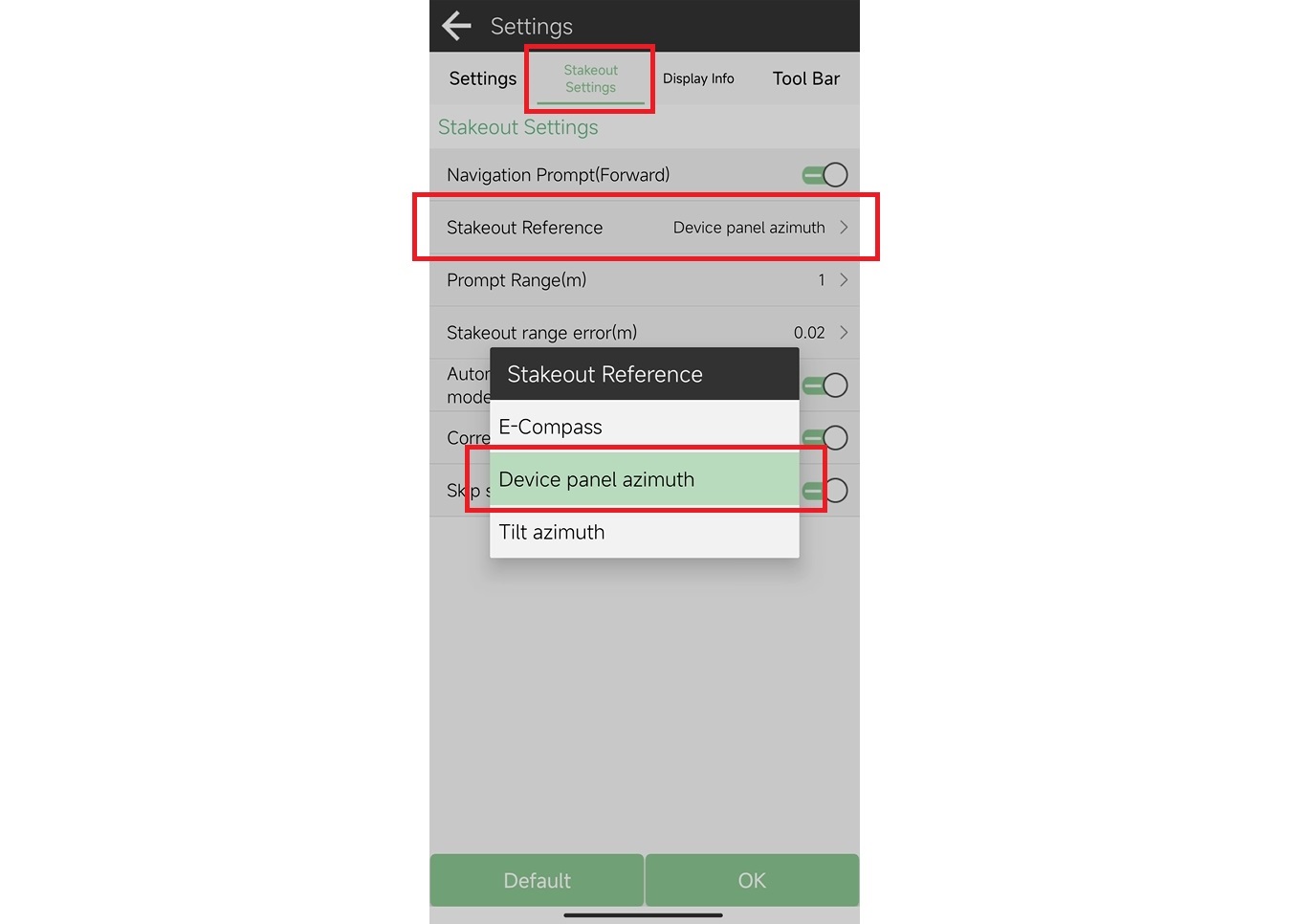 Acceda a la interfaz de replanteo del software SingularPad. Vaya a configuración >> Configuración de replanteo, seleccione la opción de referencia de replanteo como "Acimut del panel del dispositivo".