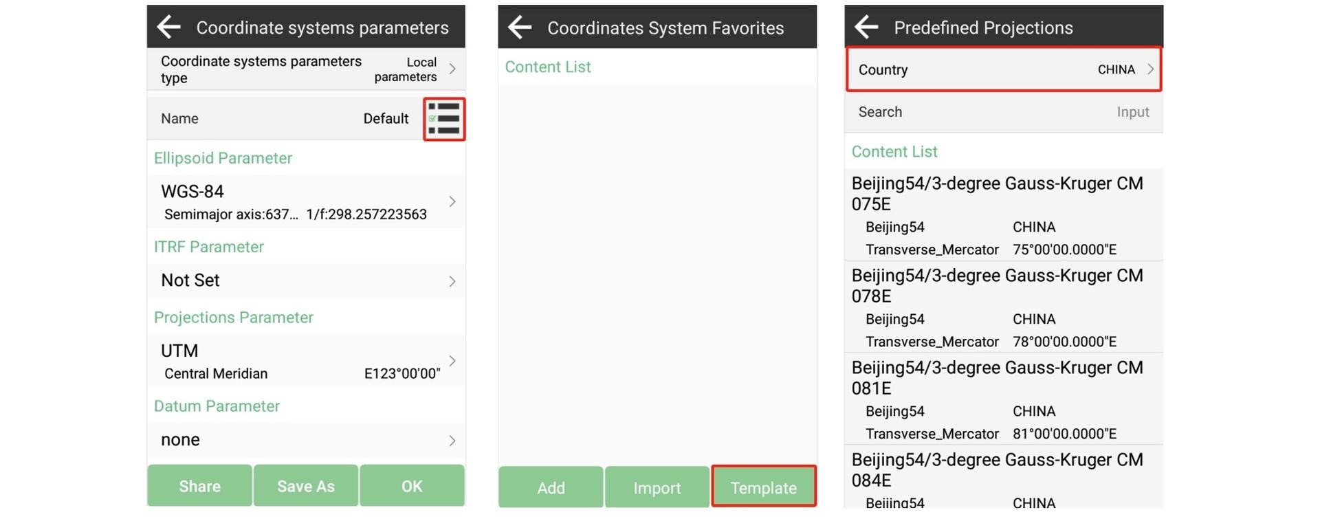Alternativamente, puede guardar y exportar los parámetros de coordenadas como un archivo.sys. Este archivo se puede compartir con los dispositivos de sus colegas a través de Bluetooth o cable, lo que garantiza una coordinación eficiente.