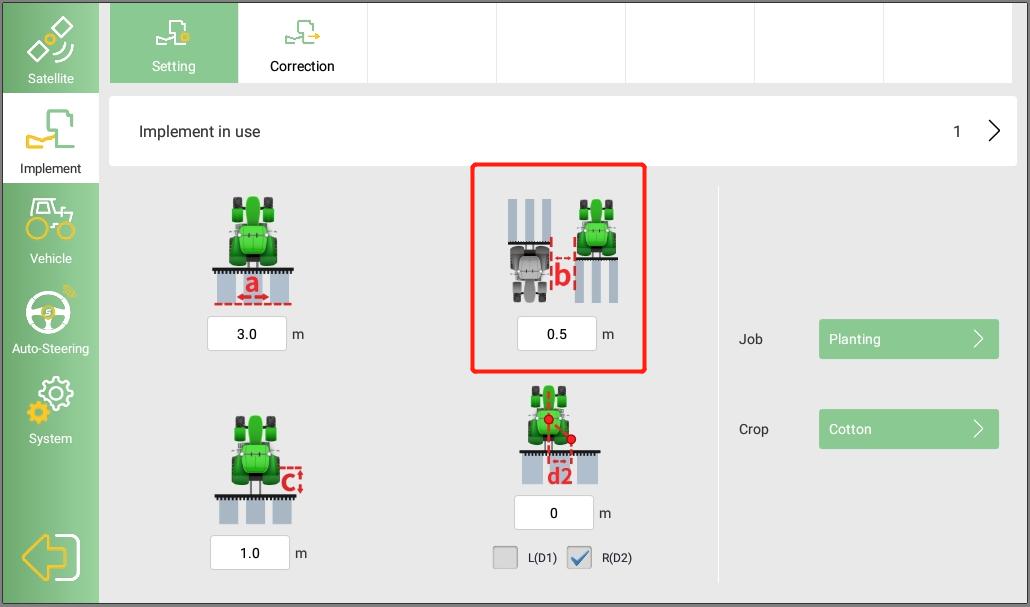 ① Compruebe si el implemento es más ancho por un lado y más estrecho por el otro. Empuje la herramienta hacia el lado más ancho. Si no se puede empujar el implemento, se puede utilizar la herramienta agrícola simulada para empujar 1/4 de la diferencia del espaciado.
