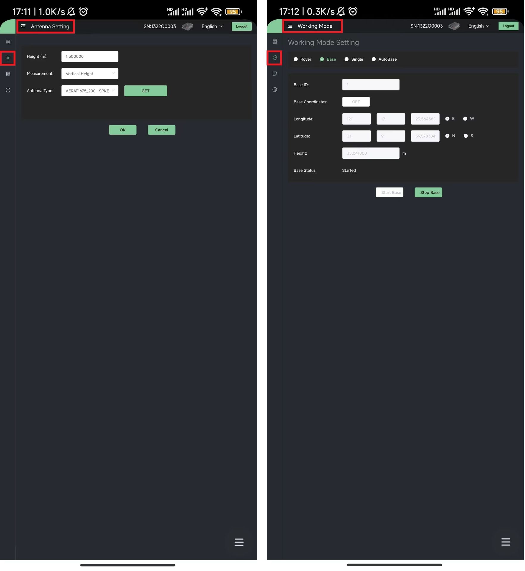 Vaya a Configuración del dispositivo >> Modo de trabajo, seleccione Modo base y haga clic en OBTENER para obtener automáticamente las coordenadas de la base, luego haga clic en Iniciar base.