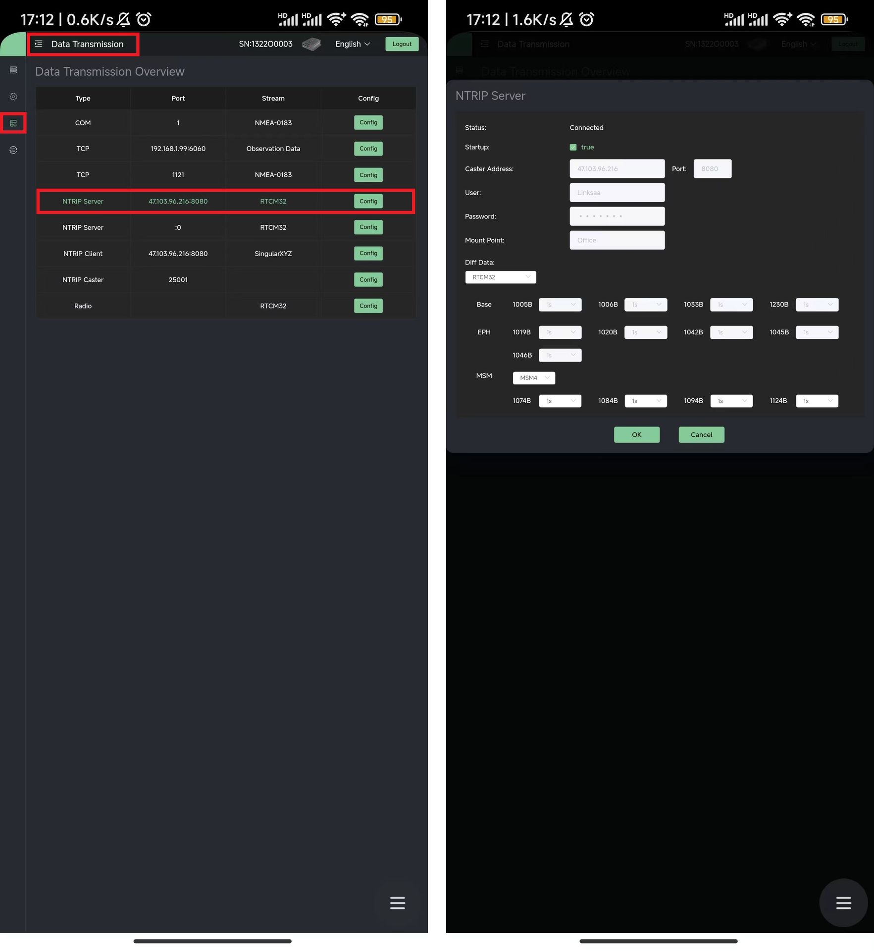 Luego vaya a Gestión del trabajo >> Transmisión de datos, haga clic para Configurar el canal del servidor NTRIP, ingrese la dirección del lanzador, el puerto, el nombre del punto de montaje y las configuraciones relacionadas para transmitir los datos diferenciales base al lanzador NTRIP. Luego marque la casilla Inicio y haga clic en Aceptar.
