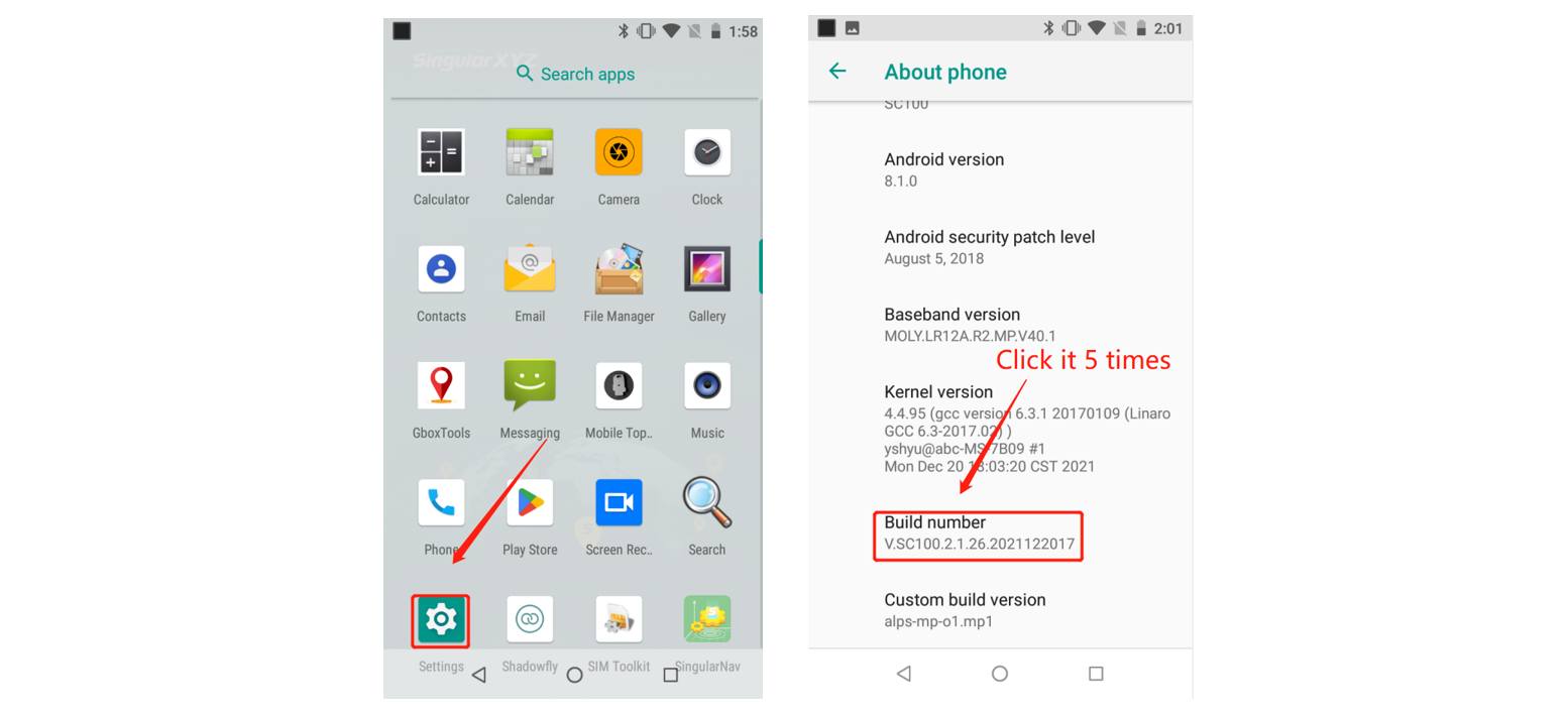 Si está utilizando el recopilador de datos SC100 o la tableta T8, debe realizar un paso adicional. Vaya a Configuración >> Sistema >> Acerca del teléfono >> Número de compilación, haga clic rápidamente cinco veces para habilitar las opciones de desarrollador.