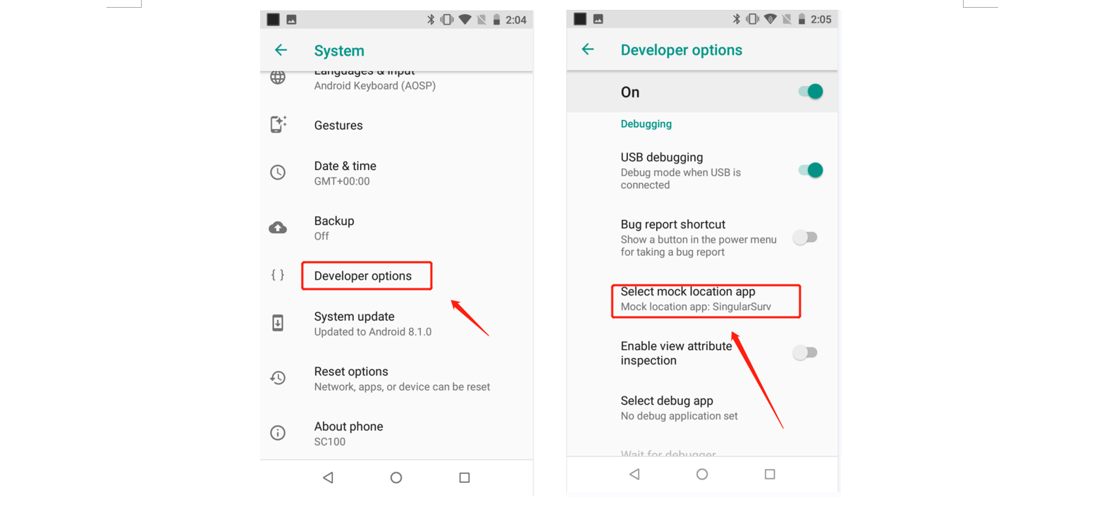 Vaya a las opciones de desarrollador en la configuración del sistema de su PDA y luego seleccione la aplicación de ubicación simulada. Haga clic y elija SingularSurv.