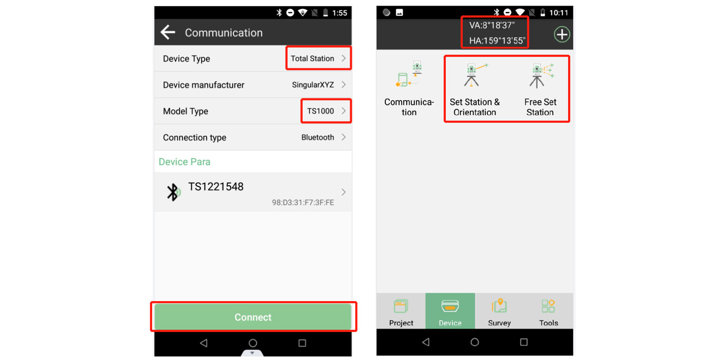 Encienda el Bluetooth de la estación total TS1000, seleccione el tipo de dispositivo de SingularPad como estación total y luego conéctese.