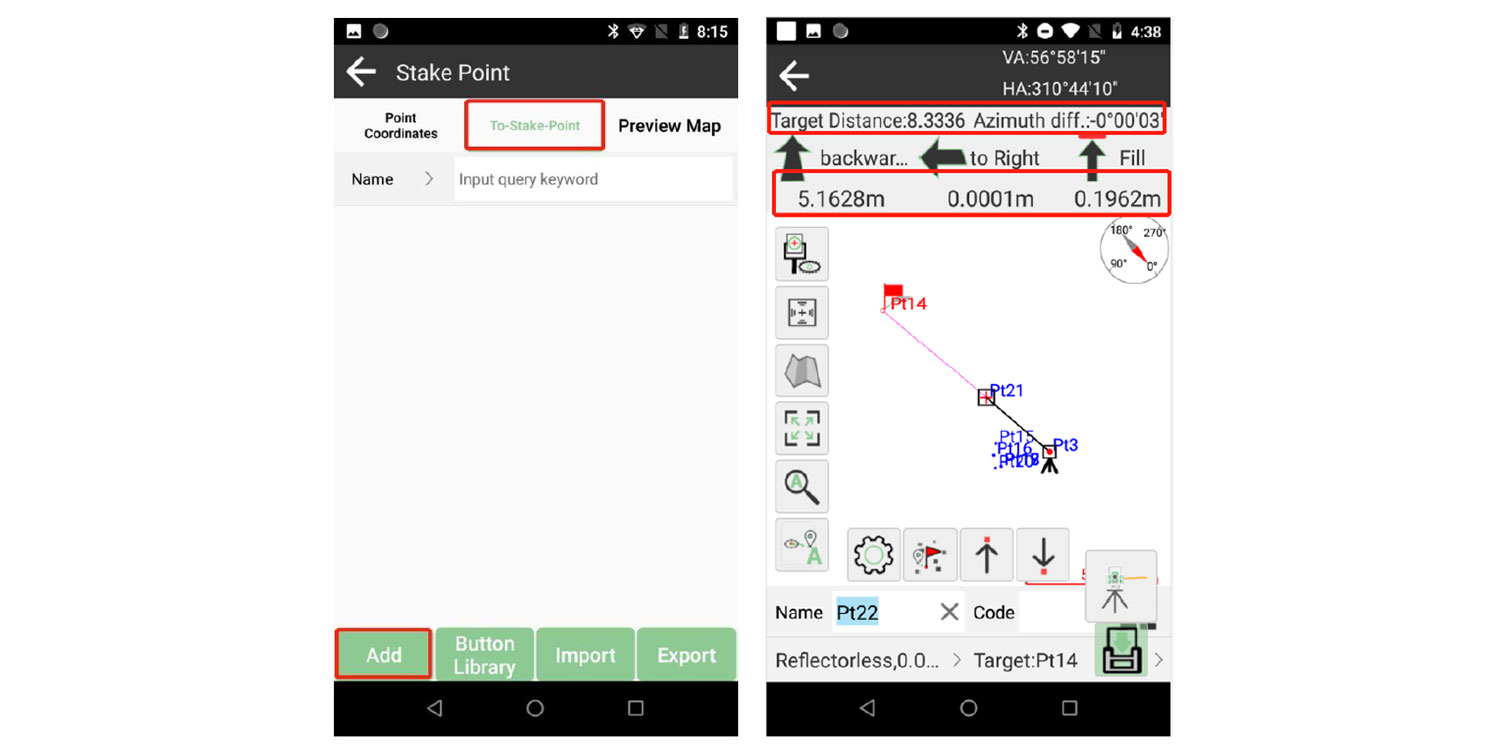 Vaya a Levantamiento >> Replanteo de puntos >> Para replantear, agregue o importe manualmente los puntos que necesita replantear y luego vaya a la interfaz de replanteo.