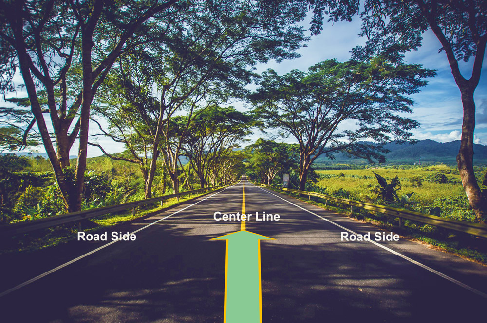 sendero (1) → bordillo (1) → línea central (1) → bordillo (2) → sendero (2)