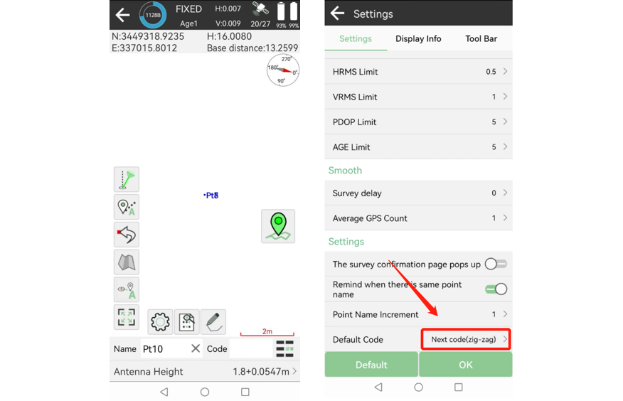 Primero, SingularPad se utiliza para conectar el receptor a través de Bluetooth y fijarlo. Luego vaya a Point Survey, abra Configuración y habilite el zigzag en la parte inferior.