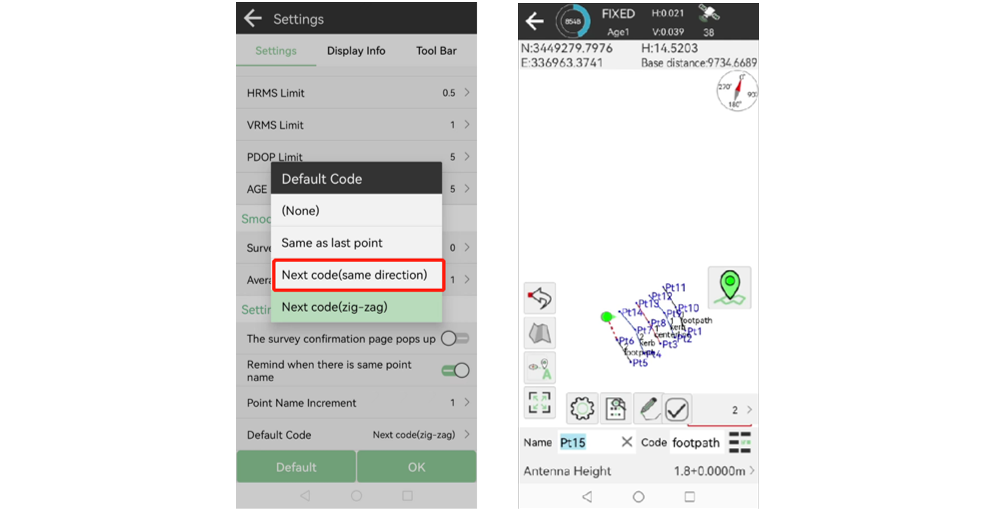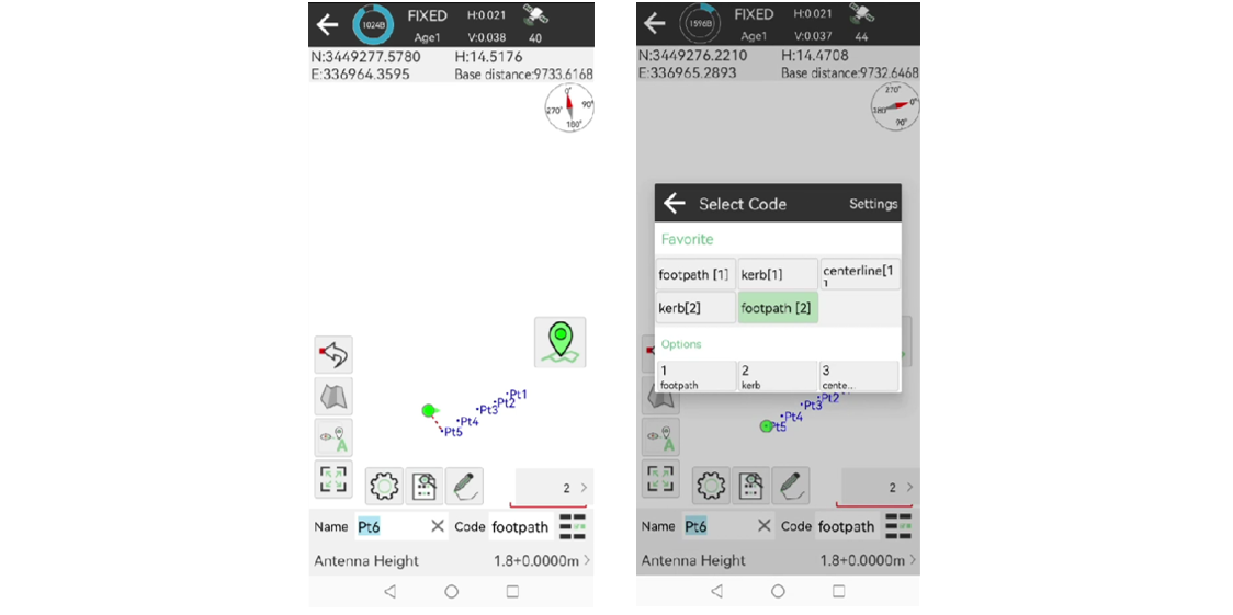 Para una tarea de medición de líneas tan largas, los topógrafos a menudo necesitan medir estas características alternativamente. Con la función Zigzag, el código de característica se cambiará automáticamente, de modo que los topógrafos puedan vigilar los automóviles que pasan, en lugar de prestar atención al software para cambiar los códigos, lo que puede proteger su propia seguridad y trabajar de manera eficiente.