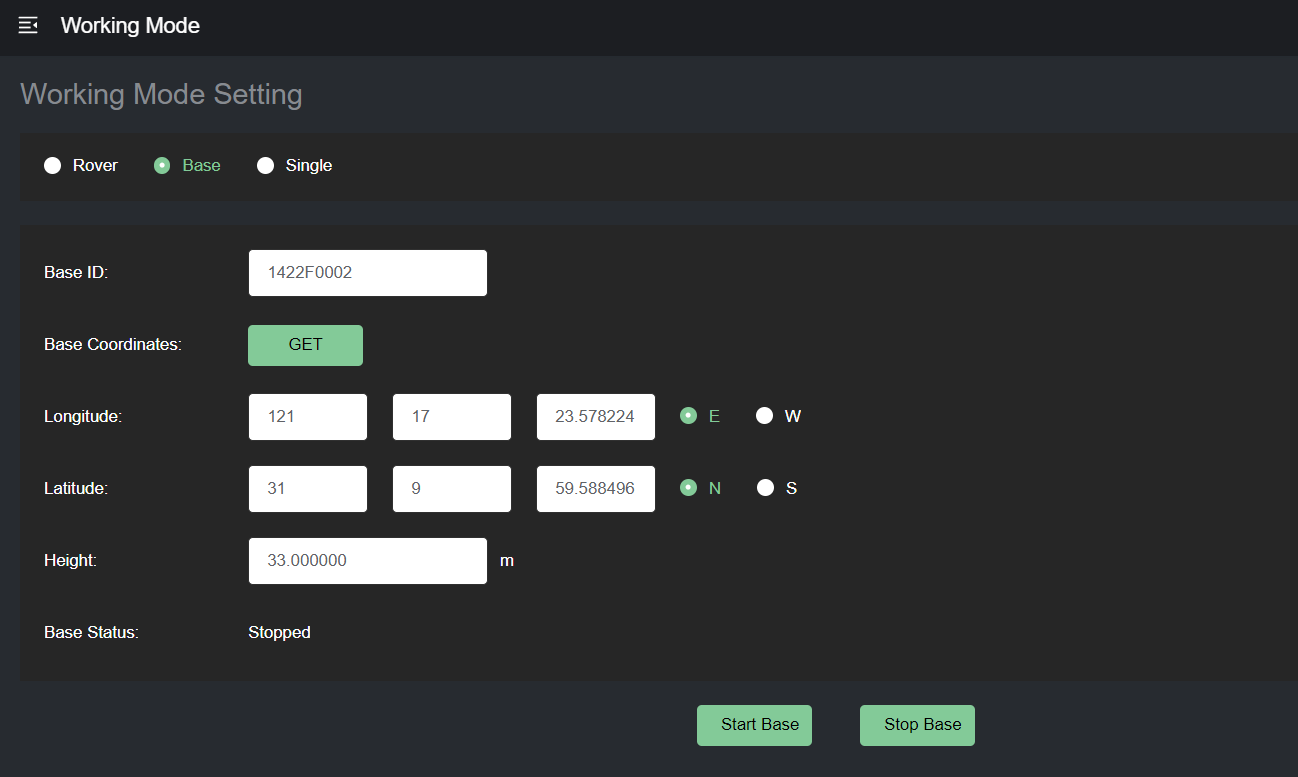 Primero, ingrese a la web de SV100 e inicie SV100 como estación base. Obtenga las coordenadas de la base y comience.