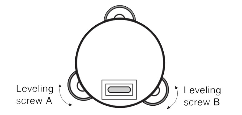 ② Ajuste los tornillos niveladores: Gire los tornillos niveladores A y B para mover la burbuja en el nivel circular. La burbuja ahora está ubicada en una línea perpendicular a una línea que pasa por los centros de los dos tornillos niveladores que se están ajustando. Luego gire el tornillo nivelador C para llevar la burbuja al centro del nivel circular.