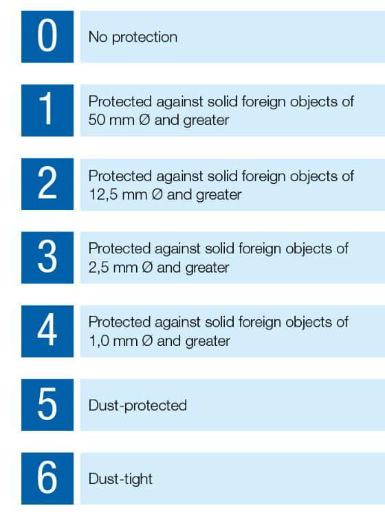 El primer número hace referencia a la protección contra objetos sólidos y se clasifica en una escala de 0 (sin protección) a 6 (sin entrada de polvo).