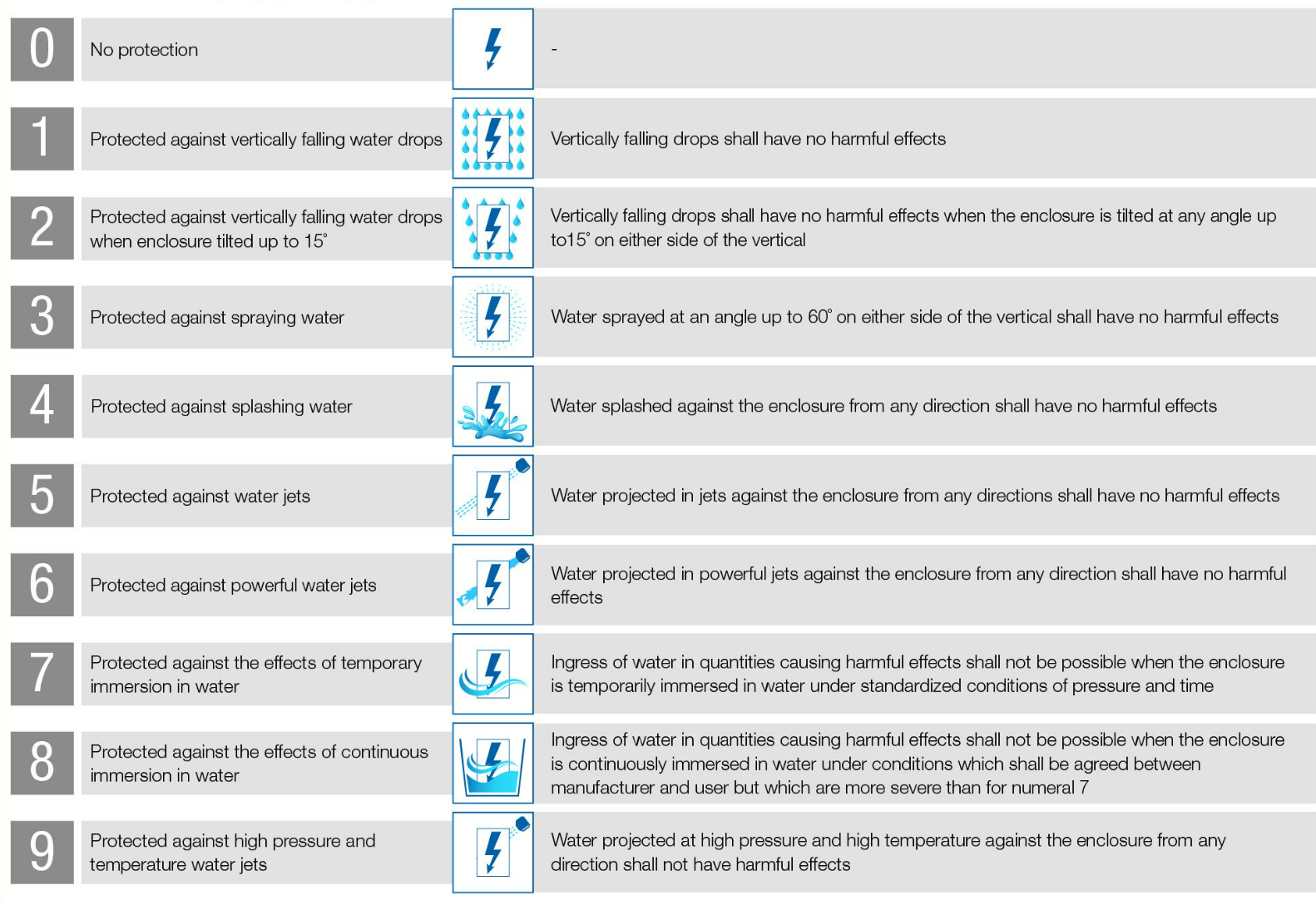 El segundo número clasifica la protección de la carcasa contra líquidos y utiliza una escala de 0 (sin protección) a 9 (agua caliente a alta presión desde diferentes ángulos).