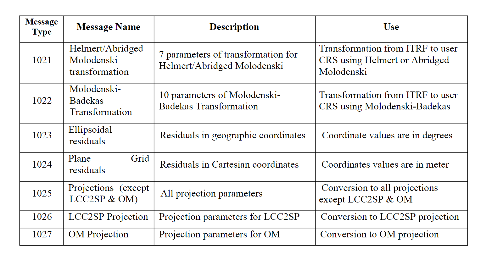 El RTCM1021-1027 contiene información de transformación de Datum local, que se detalla a continuación.