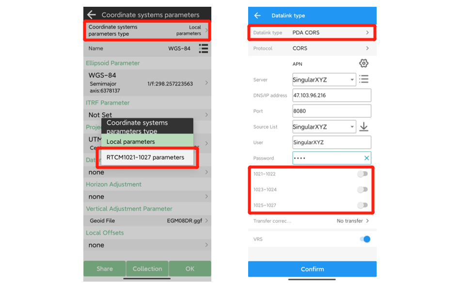 En SingularSurv, los usuarios pueden marcar las opciones RTCM1021-1027 al configurar el modo de trabajo CORS. Luego, el software recibirá la información de Datum del CORS. En SingularPad, los usuarios pueden seleccionar directamente el tipo de parámetros del sistema de coordenadas como parámetros RTCM1021-1027.