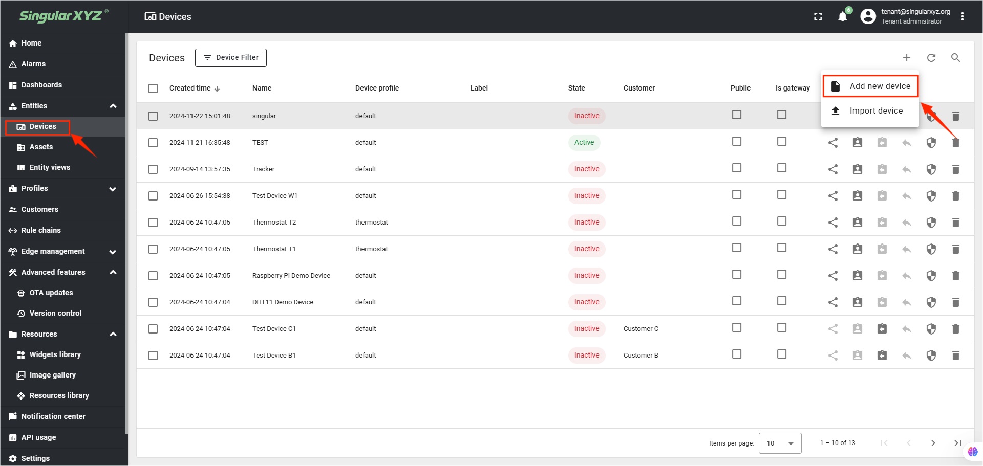 Navegue a Entidades > Dispositivos en la plataforma SingularThings, haga clic en Agregar nuevo dispositivo.