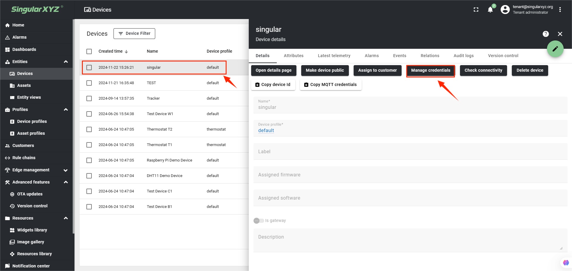 Seleccione el dispositivo recién agregado para ver sus detalles y luego haga clic en Administrar credenciales.