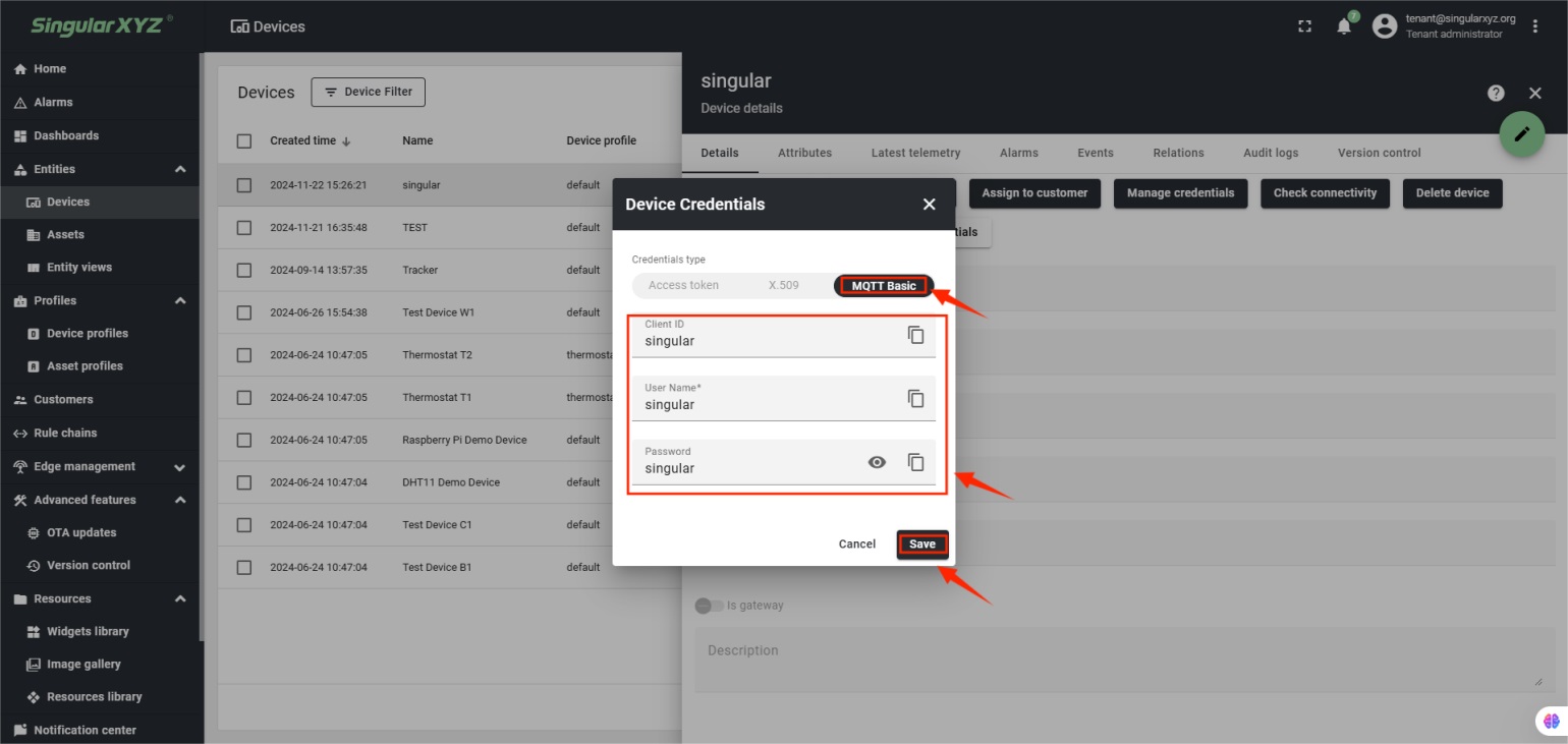 En la sección Credenciales del dispositivo, cambie el Token de acceso a MQTT Básico. Configure el ID de cliente, el nombre de usuario y la contraseña, que se utilizarán en la configuración del dispositivo P2 más adelante. Luego haga clic en Guardar para completar la configuración.