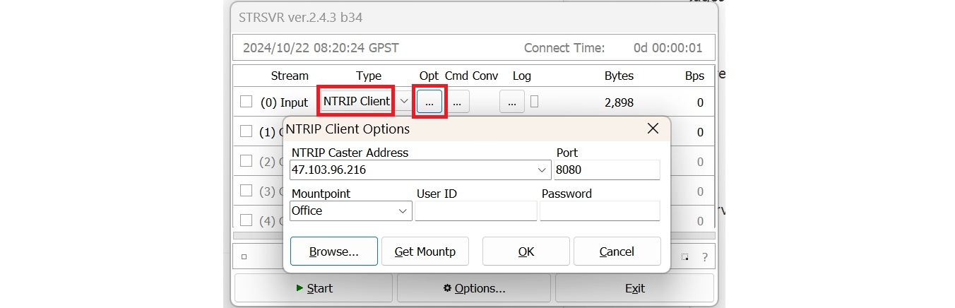 1. Seleccione el tipo de entrada como Ntrip Client, haga clic en el botón Opción e ingrese su cuenta CORS o cuenta Ntrip Caster.