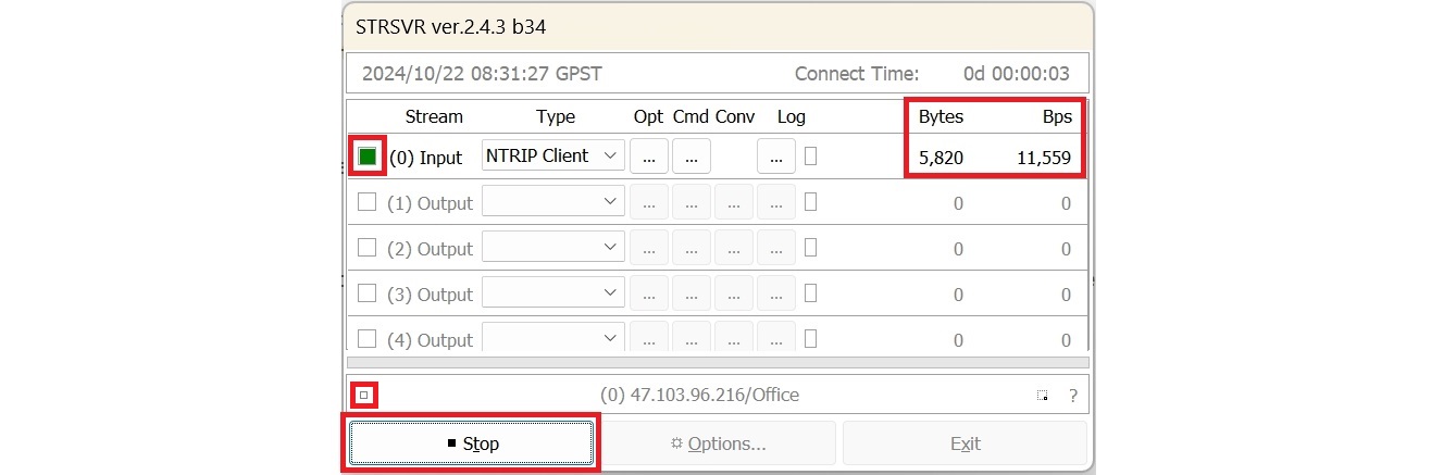 3. Haga clic en detener y seleccione el tipo de salida como Ntrip Server. Ingrese la información de la rueda en la configuración de opciones.