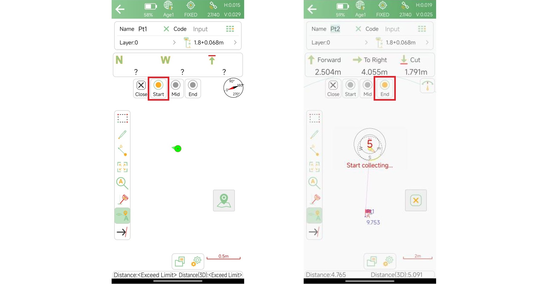Fila sur/fila norte: organiza los puntos de replanteo según la distancia de fila especificada.