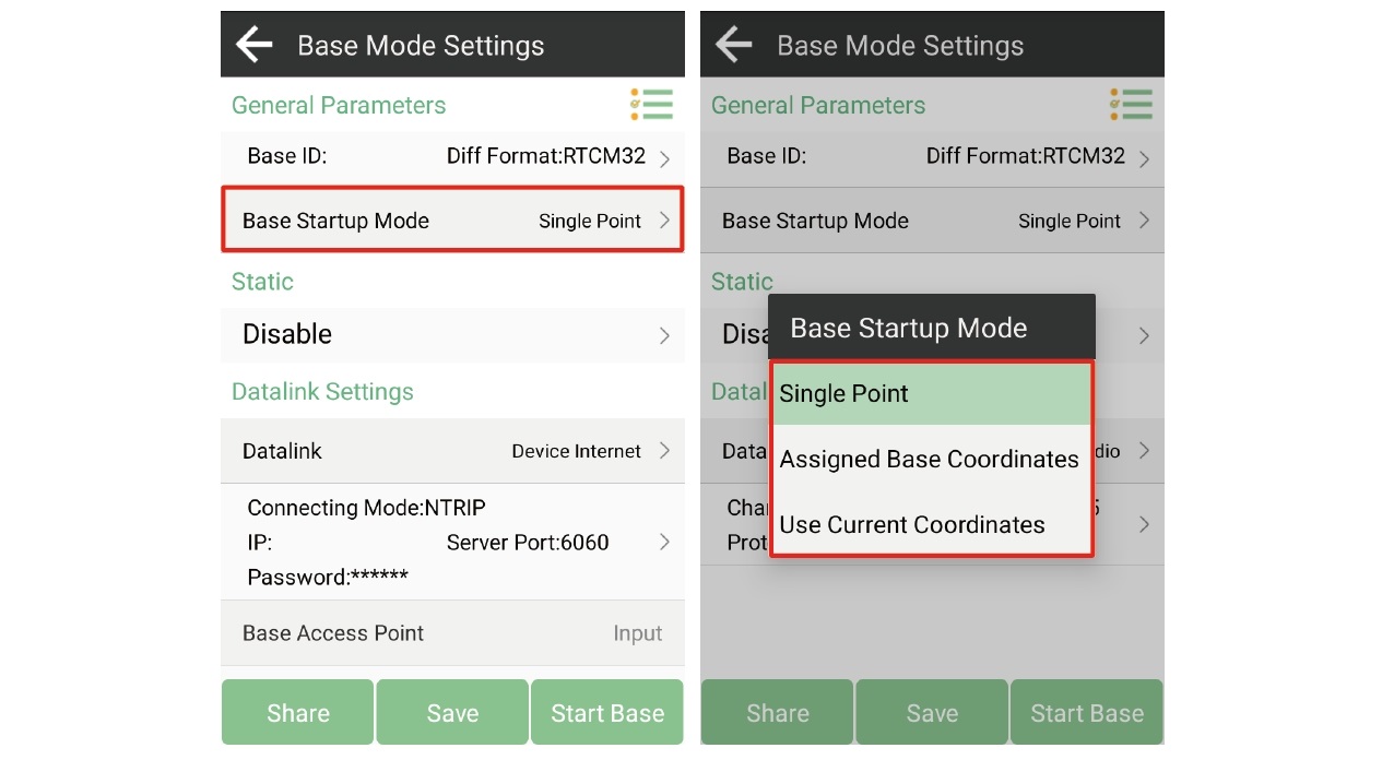 Aquí tomaremos el software de campo SingularPad como ejemplo para guiarle sobre cómo configurar el punto conocido para la estación base. Al iniciar la base, seleccione el "Modo de inicio" como modo "Coordenadas de base asignadas", luego ingrese las coordenadas del punto conocido. Esto garantiza que todas las mediciones posteriores sean consistentes con este punto de referencia.