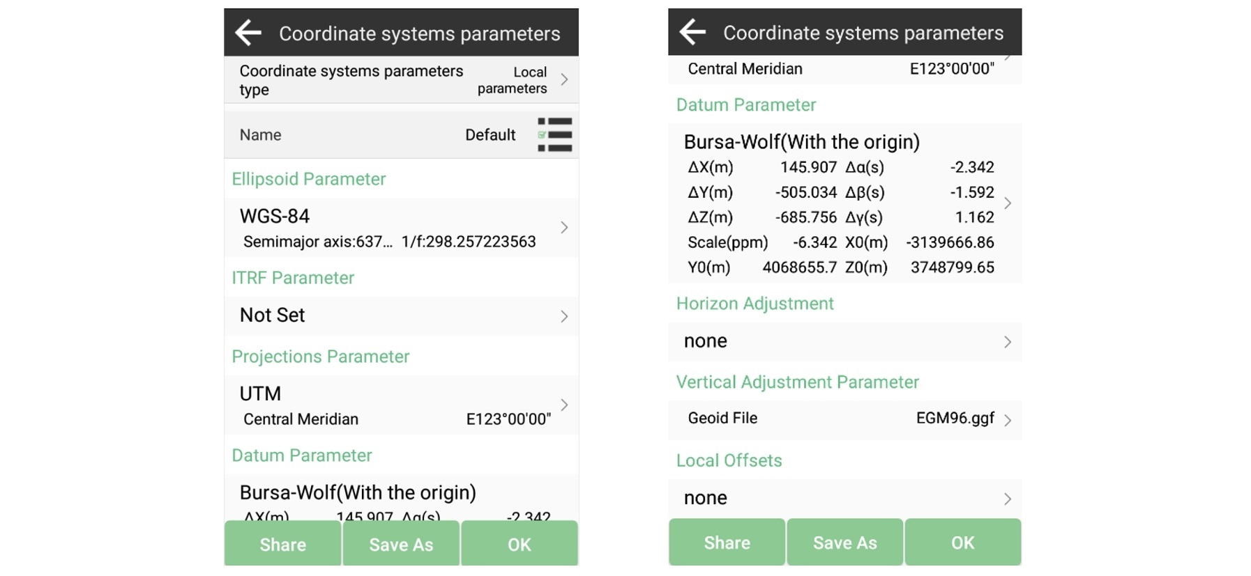 En los casos en que los parámetros requeridos no estén disponibles en la plantilla, será necesaria la entrada manual. Hay siete categorías de parámetros, que incluyen el parámetro elipsoide, el parámetro ITRF, el parámetro de proyecciones, el parámetro de referencia, el ajuste del horizonte, el parámetro de ajuste vertical y las compensaciones locales. Si bien los parámetros de elipsoide y proyecciones son obligatorios, los parámetros restantes se pueden adaptar según los requisitos de su proyecto. Los parámetros innecesarios se pueden configurar en ninguno, como se muestra en la captura de pantalla siguiente.