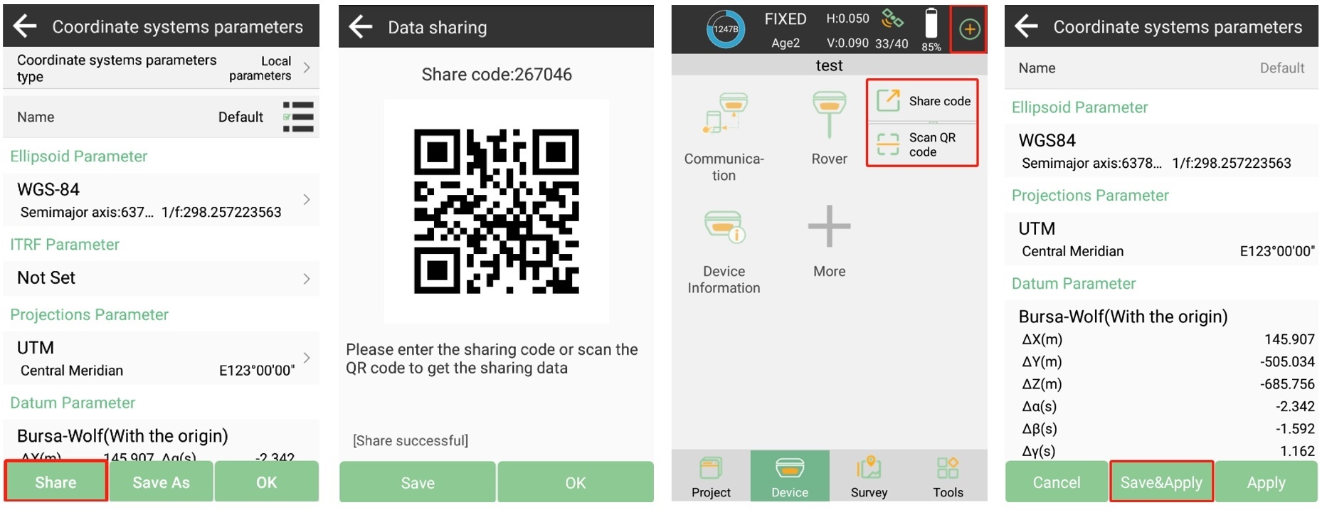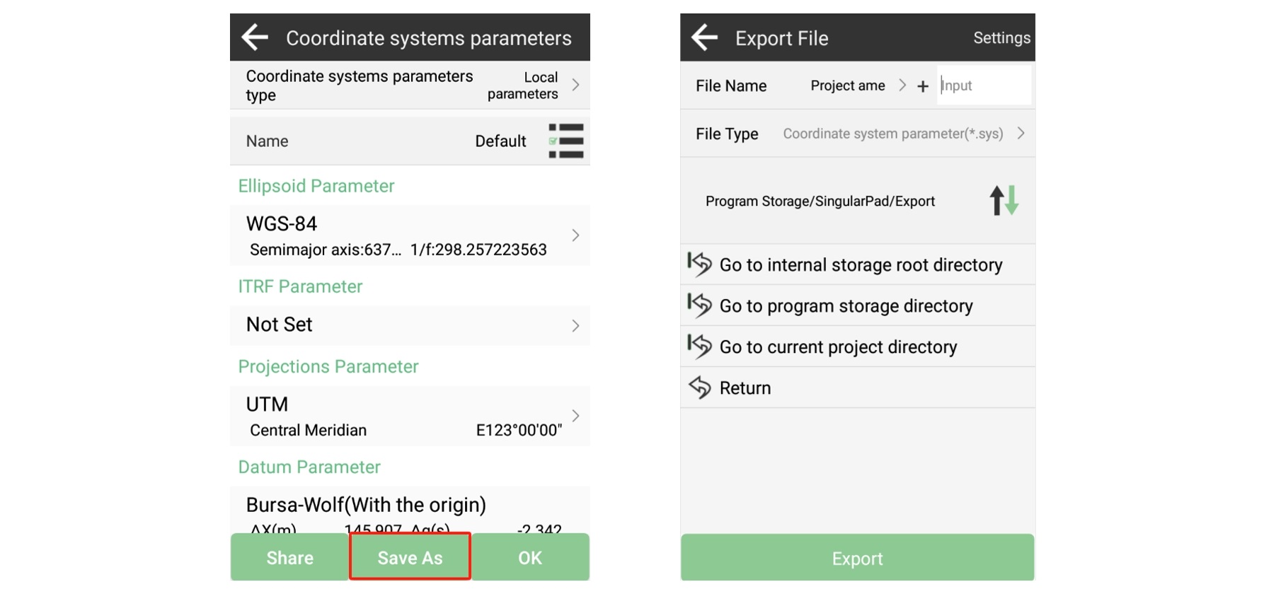 Alternativamente, puede guardar y exportar los parámetros de coordenadas como un archivo.sys. Este archivo se puede compartir con los dispositivos de sus colegas a través de Bluetooth o cable, lo que garantiza una coordinación eficiente.