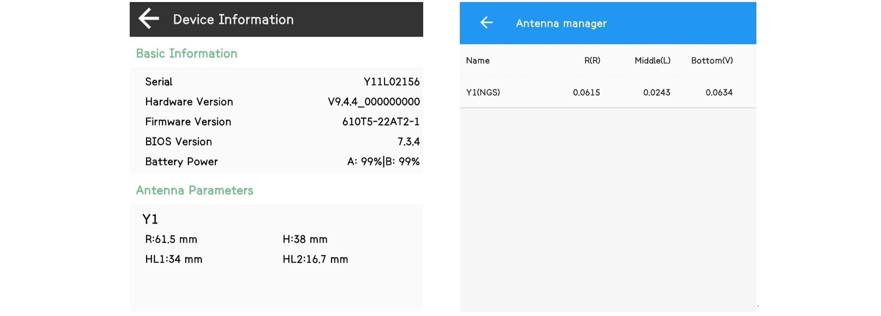Los parámetros de la antena del dispositivo correspondiente también se pueden ver cuando se conectan los receptores RTK a el software de topografía de campo SingularPad o SingularSurv.