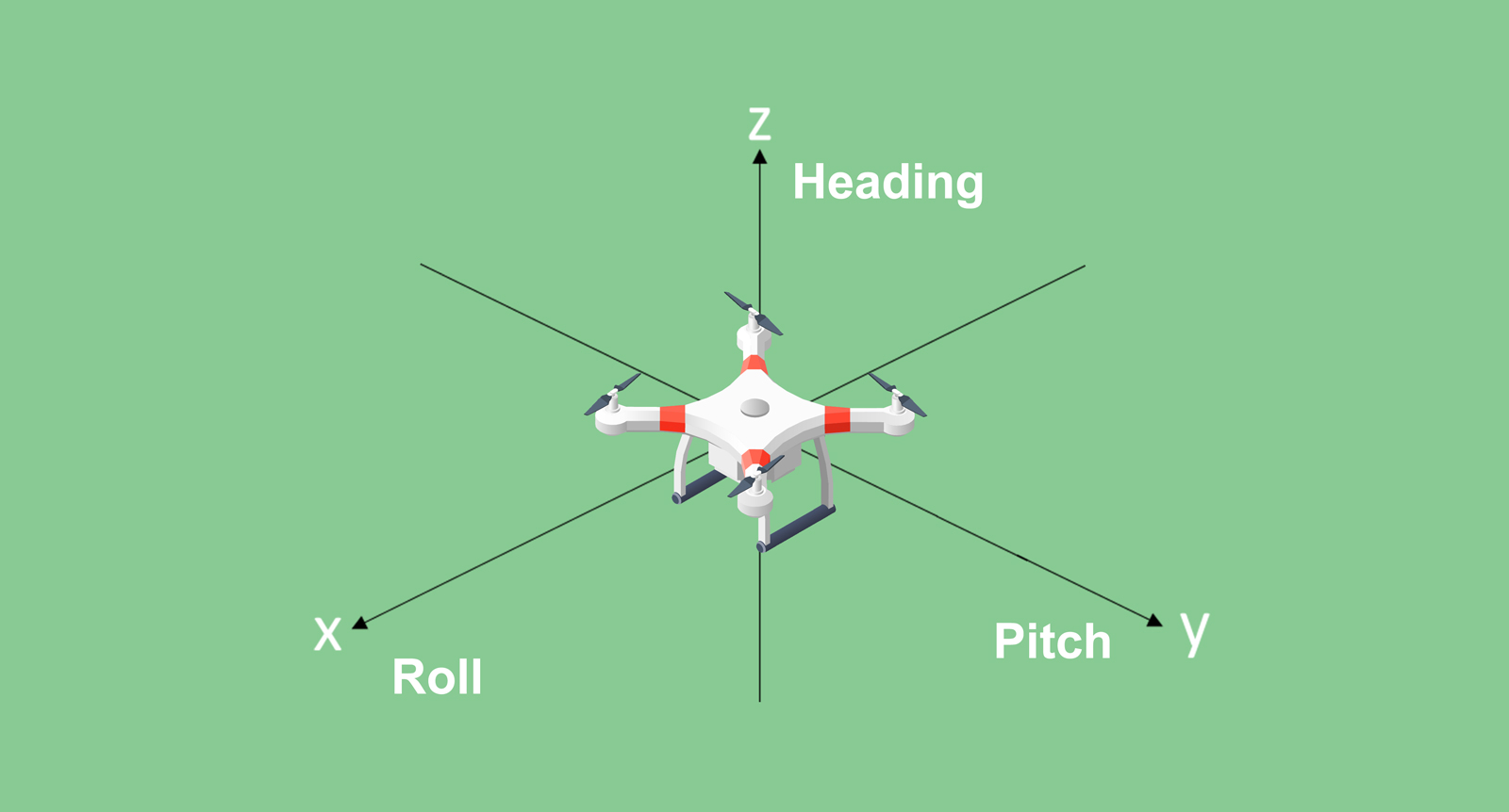 Para topografía o GIS, los datos de posicionamiento pueden satisfacer las demandas. Pero para algunas aplicaciones de navegación, como los sistemas de dirección automática para operaciones agrícolas o el guiado de vehículos aéreos no tripulados, es fundamental obtener información de orientación. Describimos principalmente esta orientación utilizando tres parámetros: cabeceo, rumbo y balanceo. El balanceo se refiere a la rotación alrededor del eje X, el paso es la rotación alrededor del eje Y y el rumbo denota la rotación alrededor del eje Z (como se ilustra en la imagen adjunta).