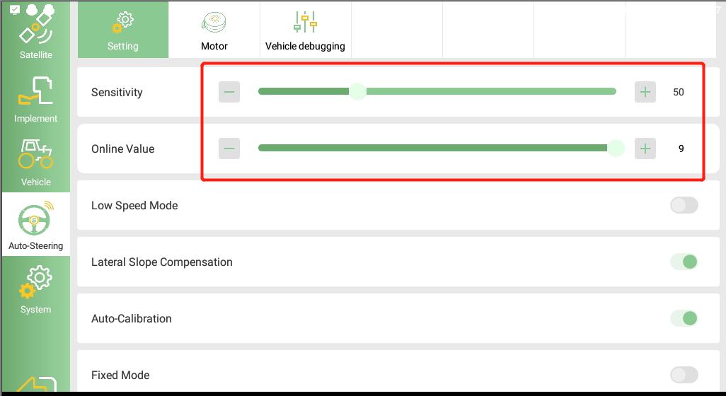 Sensibilidad: Este valor determina la velocidad a la que el tractor regresa a la línea de guía. Generalmente mantenga el valor predeterminado cuando la velocidad del tractor sea de 3 a 4 km/h. Cuando aumenta la velocidad del tractor, el valor se puede aumentar adecuadamente.