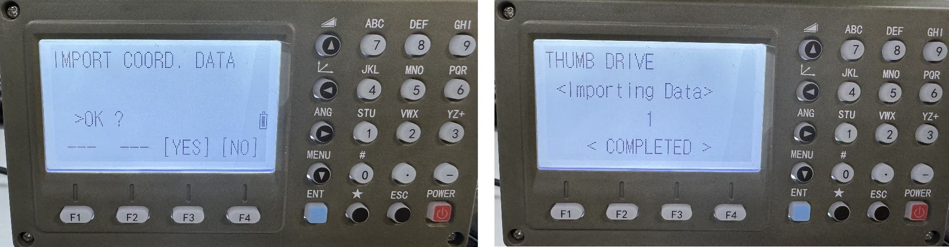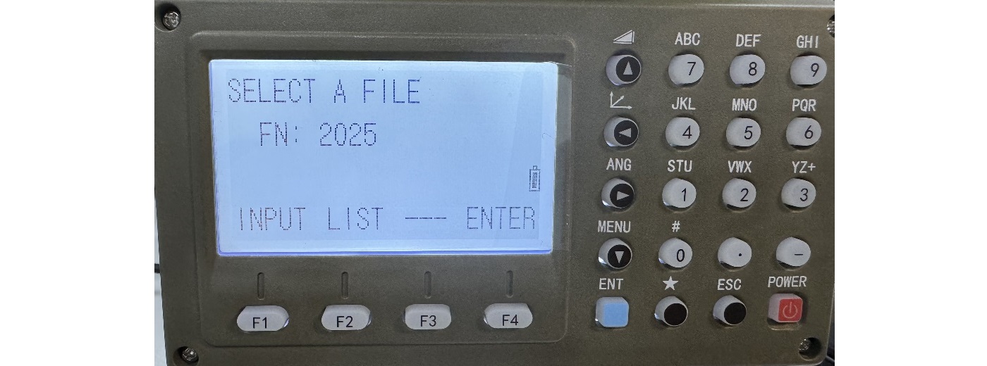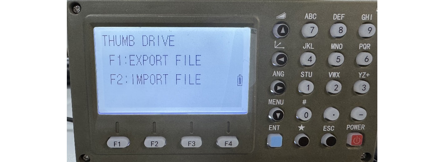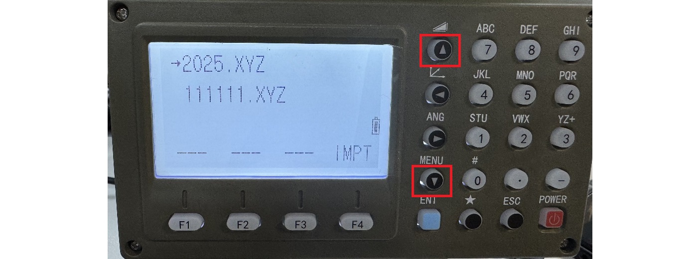 2. Seleccione el nombre de los datos que se importarán desde la memoria USB usando las teclas de flecha hacia arriba y hacia abajo en el teclado de la estación total, luego haga clic en F4 (IMPT).
