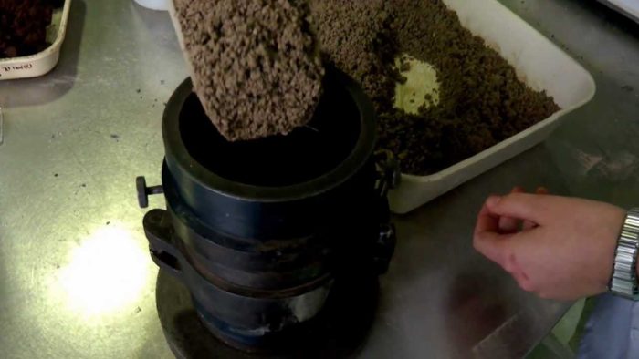 Agregue el agua a él y déjelo en el envase hermético del aire para 20hrs. Mezclar el suelo y dividirlo en 6 – 8 partes. Coloque el molde y vierta una parte del suelo en el molde como 3layers con 25 golpes de embestida para cada capa.