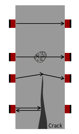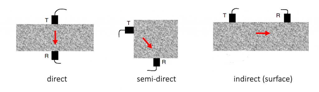 Se pueden utilizar diferentes configuraciones de transductores para realizar una prueba de UPV. Esto incluye transmisión directa, transmisión semi-directa e indirecta (superficie). La figura anterior muestra diferentes configuraciones de transductor según el acceso a la superficie del área de prueba. La velocidad ultrasónica tiende a señalar la trayectoria de viaje que se define por las configuraciones del transductor. La figura siguiente es una representación del efecto de las anomalías y deficiencias concretas en el tiempo de viaje de la onda acústica y la velocidad correspondiente a lo largo de una trayectoria determinada (ACI 228.2R, 2013).