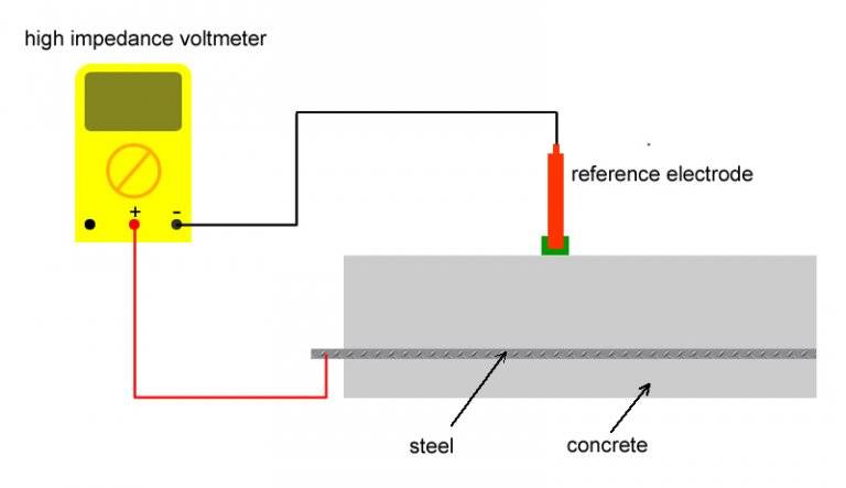 El mapeo de corrosión de media celda consiste en medir la diferencia de potencial entre un electrodo de referencia estándar, normalmente un cobre / sulfato de cobre (media celda estándar portátil) colocado en la superficie del concreto con el refuerzo de acero debajo.