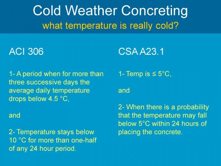 Para garantizar las propiedades estructurales necesarias del hormigón, como la resistencia y la durabilidad en climas de frío extremo, la norma CSA A23.1 especifica que se debe proporcionar protección mediante envolventes calefactadas, revestimientos o aislamiento hasta que se establezca una resistencia a la compresión de al menos 500 psi (3,5 MPa), considerándose seguros 7,0 MPa para la exposición a temperaturas de congelación.