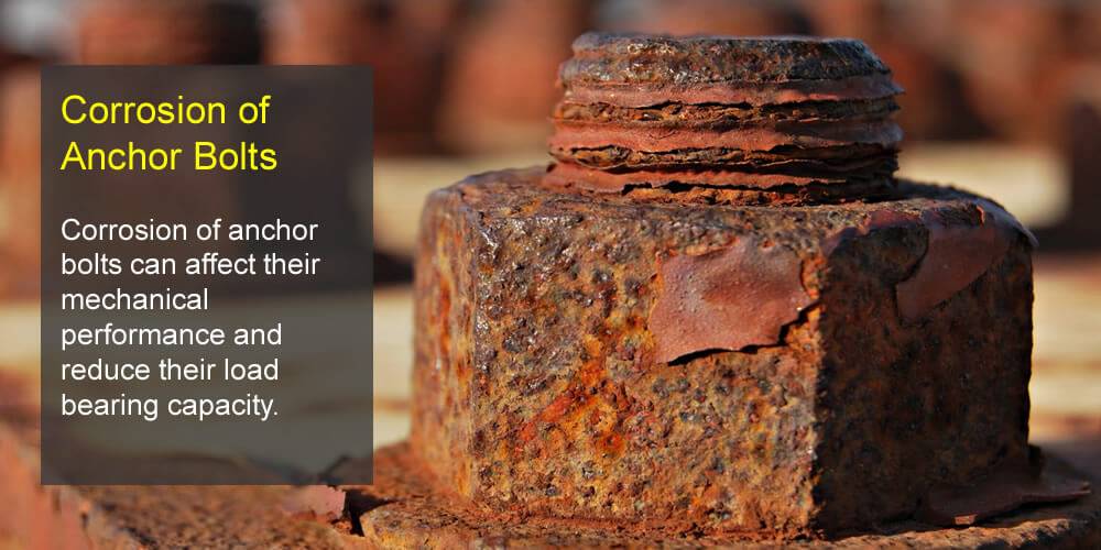 La condición de los pernos de anclaje puede permanecer desconocida, porque están incrustados dentro de la base de concreto. Sin embargo, con el tiempo, la corrosión puede iniciarse y propagarse a lo largo del ancla. Esto dará como resultado la pérdida del área de la sección transversal efectiva y, finalmente, una menor resistencia. La corrosión de la superficie del ancla también resultará en una mala unión entre el ancla y el hormigón, lo que afectará la resistencia de los pernos. En última instancia, la corrosión puede provocar grandes grietas a lo largo del ancla. La naturaleza progresiva de la reacción de corrosión, cuando se combina con cargas estructurales (es decir, cargas dinámicas, maquinaria vibratoria, etc.) puede resultar en eventos catastróficos. Por lo tanto, es necesaria una inspección y evaluación periódicas de estos pernos. Los ingenieros utilizan una combinación de señales indicadoras (inspección visual) y pruebas mecánicas (es decir, prueba de extracción) para subestimar el estado actual de los pernos de anclaje. Tinción de óxido, aumento del movimiento vibratorio, desalineación del equipo, desplazamiento extraordinario son algunos de los signos reveladores que generalmente se utilizan para evaluar el estado actual de los pernos de anclaje. Sin embargo, la mayoría de las anomalías en los pernos de anclaje permanecen ocultas hasta que ocurre un desastre (como un terremoto o cualquier otra sobrecarga significativa).