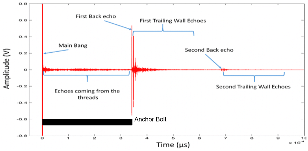 Las pruebas no destructivas (NDT) se pueden utilizar eficazmente para la inspección de la corrosión y la evaluación estructural de los pernos de anclaje incrustados. Estos métodos son rápidos, fáciles de realizar y mínimamente intrusivos. Además, las pruebas ultrasónicas de los pernos de anclaje pueden detectar posibles mecanismos de daño a una edad temprana, (mucho antes del momento en que aparecen los signos visuales en la estructura. El pulso-eco ultrasónico es una forma eficaz de evaluar el estado de estos anclajes. En este método, el transmisor y el receptor (normalmente un transductor de una pieza) se colocan en la punta del perno de anclaje. En este contexto, pulso-eco requiere una superficie de acceso muy pequeña, lo que lo hace ideal para probar pernos de anclaje. A continuación, se aplica un pulso ultrasónico a la punta del perno de anclaje. El pulso viaja a lo largo del ancla (se utiliza un rango de frecuencia específico para consideraciones prácticas). La ola se refleja desde el otro extremo del ancla o cualquier anomalía (incluidas grietas y discontinuidades) a lo largo de la longitud del ancla. El pulso reflejado es recibido por el transductor en la punta del ancla. La diferencia de tiempo entre las reflexiones que llegan se utiliza para localizar las anomalías.Conversemos