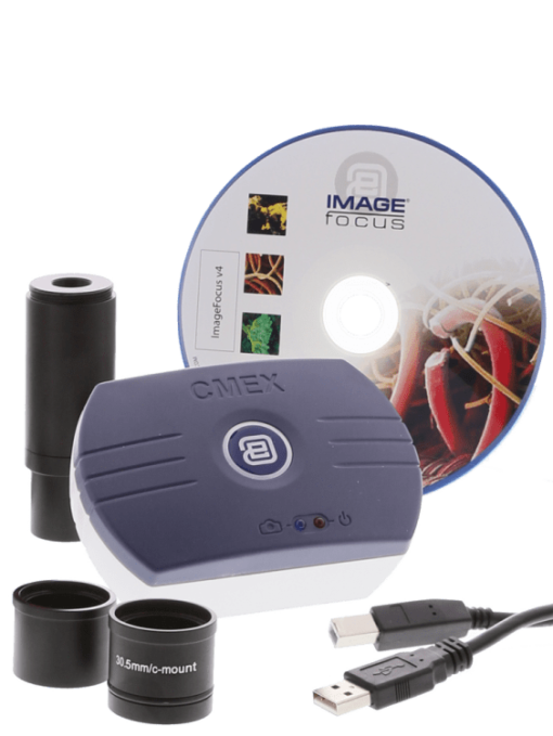 Las cámaras CMEX Pro se suministran en un estuche de lujo, cable USB-2, lente objetivo montura “C” con factor de corrección 0,5x, adaptadores de 30,0 y 30,5 mm. a 23,2 mm. Para uso de la cámara en porta-oculares de prácticamente el 100% de microscopios existentes, patrón de calibración de 1 mm / 100 (10μm / división)