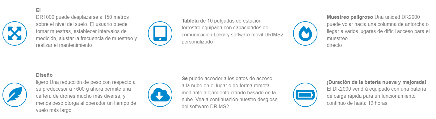 El laboratorio de vuelo de monitoreo ambiental basado en drones DR2000 proporciona una plataforma sólida para realizar evaluaciones de impacto y mediciones de calidad del aire para una amplia gama de aplicaciones. Esto incluye el monitoreo de emisiones fugitivas, emisiones de antorchas, detección de fugas a lo largo de oleoductos, metano de vertederos, emisiones de olores, aplicaciones militares o de emergencia, escaneo urbano y mucho, mucho más.