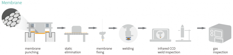 - Membrana microporosa: Membrana de punzonado – Eliminación de estática – Fijación de membranas – Soldadura – Inspección de soldadura CCD infrarroja – Inspección de gas